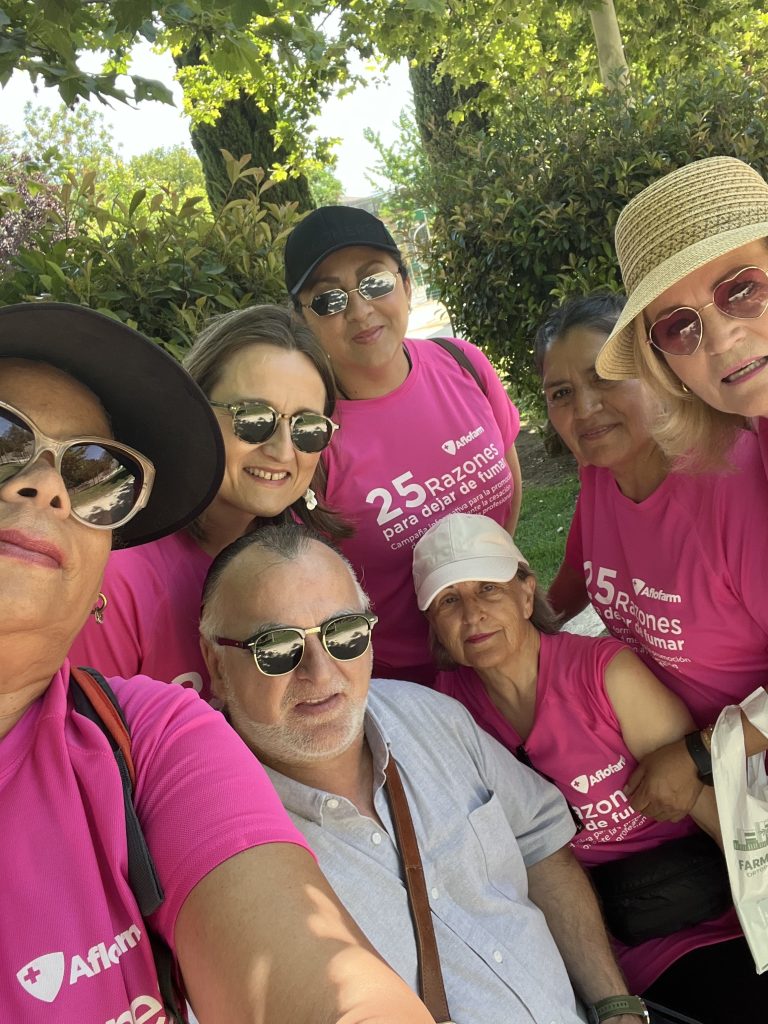 El laboratorio Aflofarm colaboró con nosotros proporcionando diferentes materiales, entre ellos unas camisetas rosas con el eslogan “25 razones para dejar de fumar”.